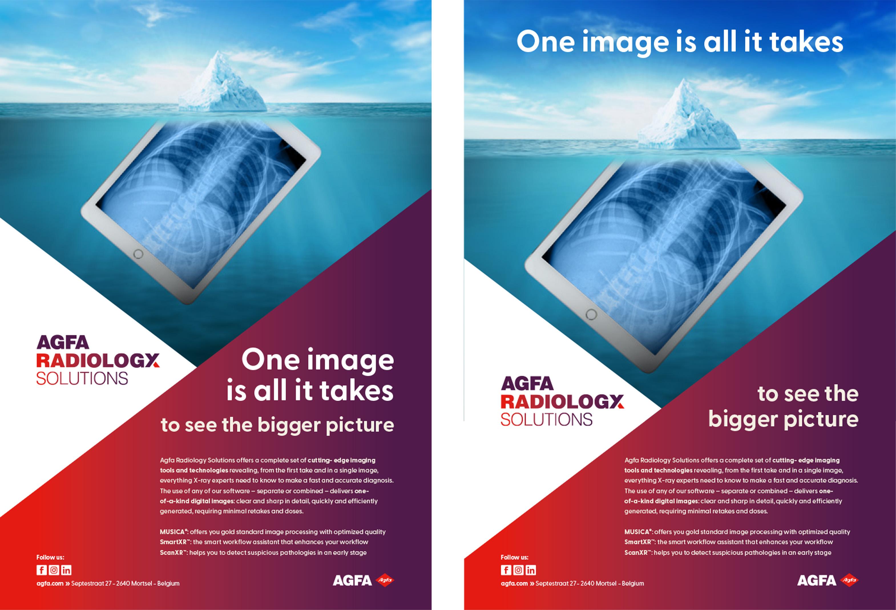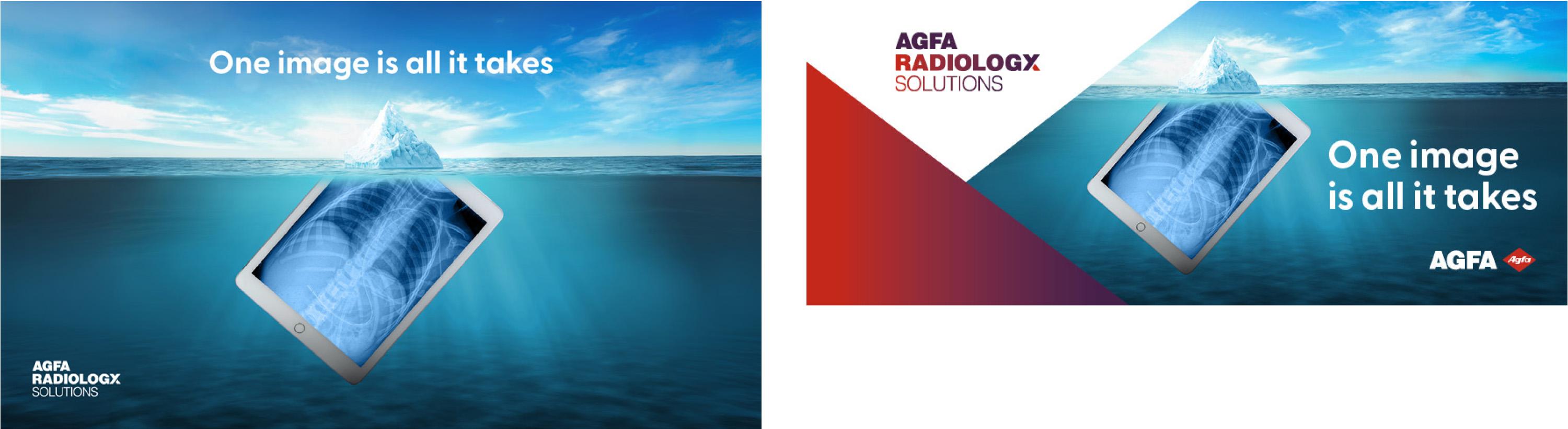 Free space: Please give the Agfa Radiology Solutions logo some space to breathe. The height of the capital ‘A’ in ‘AGFA’ is the strict minimum free space on all sides of the logo. Give the logo more space whenever you can.